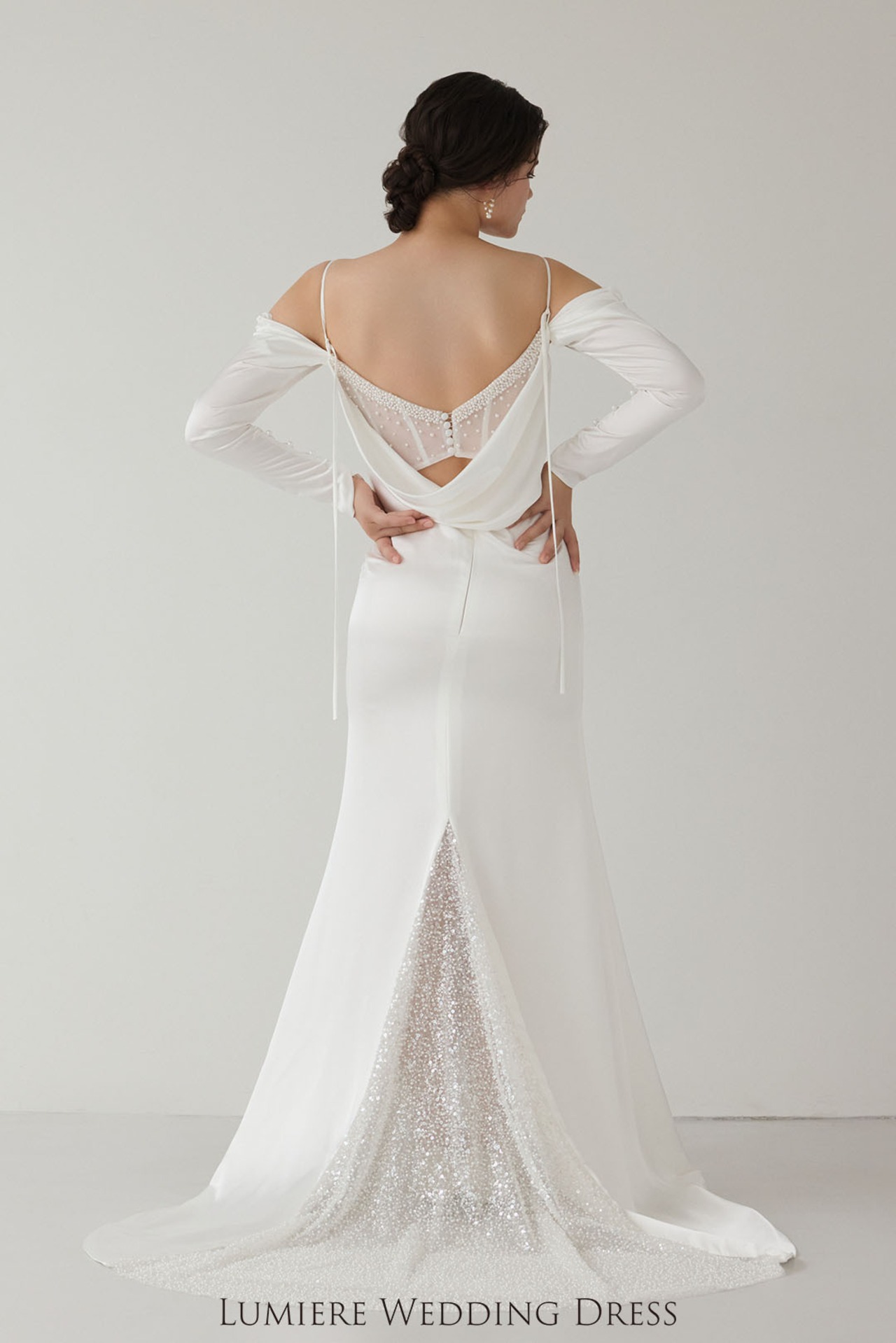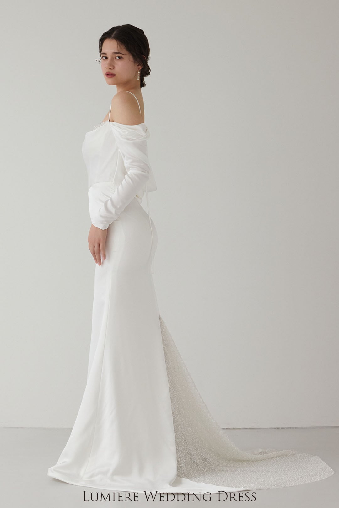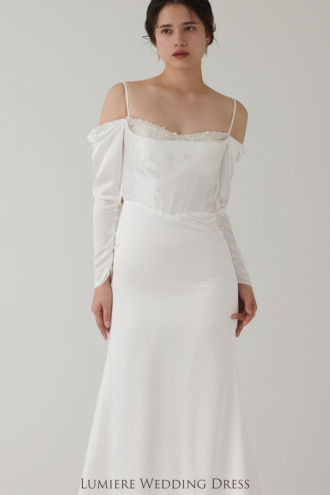 胸元とトレーンに贅沢にあしらったパールが目を惹く、